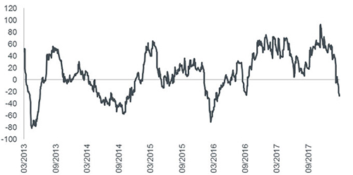 (Quelle: Bloomberg, Stand: 13. März 2018. Ökonomischer Überraschungsindex von Citi für die Eurozone. Dieser misst die Abweichungen der tatsächlichen Wirtschaftsdaten von den zuvor von Ökonomen getroffenen Prognosen. Ein Wert unter null zeigt an, dass die aktuellen Wirtschaftsdaten schlechter als erwartet ausgefallen sind.)