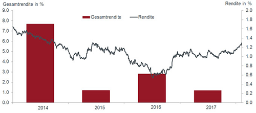Schon seit etwa 18 Monaten befinden wir uns in einer Art Baisse, denn seit Sommer 2016 steigen die Renditen von Staatsanleihen aus Industrieländern wieder. Die Bedeutung dieses Augenblicks blieb von den meisten jedoch unbemerkt, da Staatsanleihen sowohl 2016 wie auch 2017 positive Gesamterträge abwarfen, wie Abbildung 1 zeigt. Ein klassischer Bärenmarkt sieht anders aus! Noch besser fiel die Bilanz für Anleger aus, die Unternehmens- oder Schwellenländeranleihen im Depot hatten. Und wer den volatilen, ungleichmäßigen Zinsanstieg geschickt umschiffte, konnte sogar mehr als ansehnliche Erträge einstreichen.