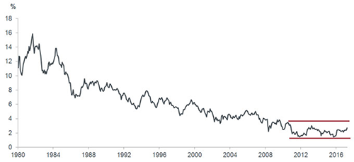 (Quelle: Bloomberg, Rendite zehnjähriger US-Staatsanleihe, vom 31. Januar 1980 bis 31. Januar 2018.)