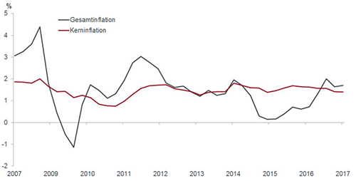 An den Anleihemärkten rund um den Globus müssen Anleger zurzeit mit kräftigem Gegenwind in Form steigender Leitzinsen und gedrosselter Wertpapierkäufe der Zentralbanken zurechtkommen. Nach dem Ende der ultralockeren Geldpolitik fragen sich viele nun, wer künftig bei Anleihen als Grenzkäufer in die Bresche springt. Aber auch für die Geldpolitik gibt es Grenzen. So kann die Europäische Zentralbank beispielsweise die Zinszügel nicht zu kräftig anziehen, wenn sie nicht riskieren will, dass ein hochschnellender Euro den Exportmotor abwürgt. Fehlentscheidungen der Währungshüter könnten zudem die Stabilität an den Aktienmärkten und damit eine der wichtigsten Komponenten eines stabilen Finanzsystems gefährden. Außerdem sind die Zentralbanken bei ihren Entscheidungen von der Datenlage abhängig. Und die in dieser Hinsicht wichtigste Datenkomponente, nämlich die Kerninflation, tritt weiter quasi auf der Stelle, wie aus Abbildung 3 hervorgeht.