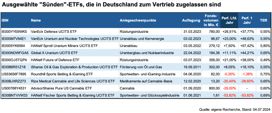 Für Anleger, die solch einer Empfehlung folgen und die darüber hinaus ohnehin keine ethischen oder ökologischen Bedenken bei der Geldanlage haben, könnten dann auch Fonds interessant sein, die ganz gezielt in nicht-ESG-konforme Assets investieren. Das kann sich aus rein renditeorientierter Betrachtung lohnen. Schließlich ist es kein Geheimnis, dass zum Beispiel Rüstungsunternehmen oft hochprofitabel sind und insbesondere im Moment Hochkonjunktur haben. Wie stark deren Aktienkurse gerade steigen, lässt sich an der Entwicklung der beiden in Deutschland zum Vertrieb zugelassenen ETFs beobachten: Der Future of Defence ETF von HANetf investiert in Rüstungs-Unternehmen und Anbieter von Cybersicherheitslösungen, die Verträge mit der NATO oder deren Verbündeten haben. Der ETF wurde ziemlich genau vor einem Jahr aufgelegt. Seitdem ist der Kurs des börsengehandelten Fonds um 38 Prozent gestiegen. Der VanEck Defense UCITS ETF überzeugt mit einer ähnlich starken Performance. Zum Vergleich: Der Weltindex MSCI World schaffte im selben Zeitraum nur eine Wertsteigerung von 22 Prozent.