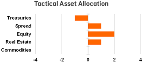 We upgrade equities from a small to a medium overweight. We keep our focus on a combination of growth and income, but in view of the macroeconomic environment, we decided to dial up the growth exposure.