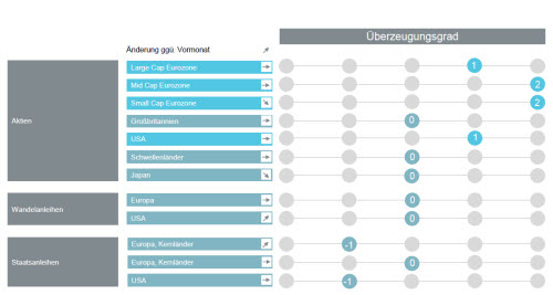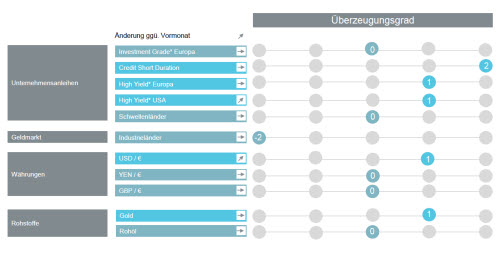 Das Konjunkturumfeld präsentiert sich hinreichend freundlich und erlaubt auf Anlageseite durchaus Risikofreude. Dementsprechend sehen wir uns mit unserer Übergewichtung in Aktien und untergewichteter Duration gut aufgestellt für ein sich weiter stabilisierendes globales Wachstum und ein Abebben der vorherrschenden Deflationsangst.
