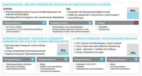 Der verarbeitende Sektor ist auf Erholungskurs, beflügelt von der Nachfrage sowohl seitens der privaten Haushalte als auch der Unternehmen der Industrieländer.Hinzu kommt eine solide Berichtssaison in den USA, Europa und Japan. In regionaler Sicht halten wir an unserem deutlichen Fokus auf Europa fest. Hintergrund ist die deutliche Unterbewertung europäischer Anlagewerte. Möglicherweise müssen erst noch die Wahlen in Frankreich und Deutschland abgewartet werden, bevor sich diese Positionierung in vollem Umfang auszahlt. Auch in Nordamerika setzen wir auf unterbewertete Titel sowie Werte mit etwas stärkerem Wachstumsprofil. Auf rein taktischer Basis sind wir zudem in den Schwellenländern positioniert. Angesichts der zunehmend isolationistischen Tendenzen und der daraus erwachsenden Risiken engagieren wir uns verstärkt in Titel kleiner oder mittlerer Kapitalisierung in Europa wie auch in den USA.