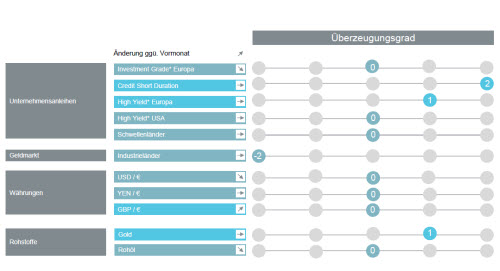 Auf der Rentenseite haben wir die Duration bei deutschen Anleihen mittels Optionen etwas erhöht und geben weiterhin Hochzinsanleihen den Vorzug, die weiterhin sehr überzeugendes Ertragspotenzial bieten. Zur taktischen Positionierung und zur Absicherung ziehen wir zudem Gold in Betracht.