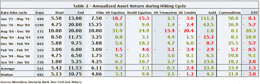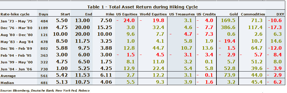 People in general, but investors in particular, too often believe that ‘this time is different.’ This tendency makes history an obvious place to start looking for an answer. The table below shows the returns of a series of major asset classes during the last eight Fed hiking cycles, starting in 1973. Admittedly, the table holds a lot of data, but when scrutinized they reveal some interesting insights.