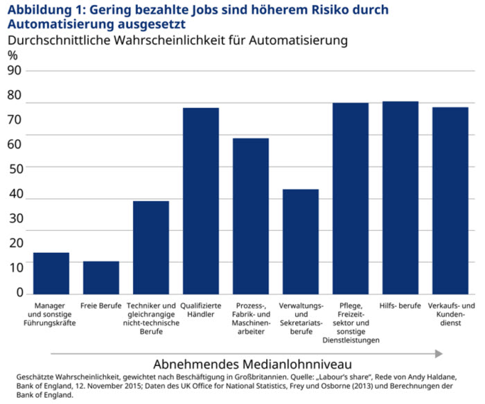 Viele würden an dieser Stelle anführen, dass die schädlichen Auswirkungen der Automatisierung in den USA bereits zu spüren sind, wo Technologie und Globalisierung in den vergangenen Jahrzehnten zu einer „Aushöhlung“ der Arbeitsplätze im Fertigungssektor geführt haben. Nun schreitet die Automatisierung auch in gering qualifizierten Dienstleistungstätigkeiten sowie in Bereichen rasant fort, die traditionell hoch qualifizierten Büroarbeitern vorbehalten waren (wie die Beispiele von Reuters und IBM zeigen).