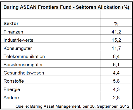 SooHai Lim weiter, “Während sich die Welt in den letzten vier Jahren auf die europäische Schuldenkrise und andere große Themen konzentriert hat, sind die ASEAN Wirtschaften kontinuierlich gewachsen und haben stabile Erträge generiert. Dass die ASEAN Märkte in den MSCI Indizes gemessen an ihrer BIP Gewichtung weiterhin unterrepräsentiert sind, bietet weiteres Potential für eine Outperformance gegenüber den breit aufgestellten globalen Indizes, insbesondere unter dem Gesichtspunkt, dass die handelbaren Aktien in diesen Märkten zunehmen. Die Situation beschränkt sich nicht nur auf Large-Caps. Kleinere und mittlere Unternehmen spielen im ASEAN Investmentuniversum weiterhin eine wichtige Rolle. Eine aktive Aktienauswahl und ein umfassendes Verständnis, was die Dynamik der ASEAN Region angeht, sind für eine überdurchschnittliche Fondsperformance unumgänglich und diese Komponenten bilden den Kern des Erfolges des Baring ASEAN Frontiers Fund. Über einen Zeitraum von drei Jahren bis zum 30. September 2012 hat der Baring ASEAN Frontiers Fund einen annualisierten Ertrag von 19,9%5 generiert und wir sehen weiterhin starke Erträge aus der Region, da der steigende Wohlstand und die vermehrten Ausgaben im Privat-, Unternehmens- und Staatssektor die regionale wirtschaftliche Entwicklung unterstützen und vorantreiben.“