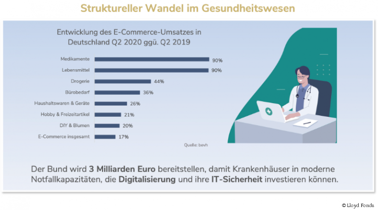 Als weiteren Bereich, der von der Corona-Pandemie stark profitiere, nennt Thaler die E-Commerce-Branche: „Im Lockdown ist der stationäre Einzelhandel erwartungsgemäß zusammengebrochen. Aber auch seit Juni ist die Verschiebung hin zum Onlinehandel bestehen geblieben. HelloFresh zum Beispiel war im Lockdown ein Boomwert, die die Marke von drei Milliarden Euro an Umsatz geknackt hat“ sagt Maximilian Thaler, der sein Augenmerk weniger auf die E-Commerce-Marktführer wie Amazon, Zalando oder Asos richtet. Er stellt eher die Frage: Wer sorgt für die Infrastruktur? Und wird zum Beispiel bei Interroll fündig, einem europäischen Marktführer für Materialflusslösungen. „Egal, ob Amazon oder Zalando: Interroll ist immer dabei. Wenn die Anzahl der Sendungen massiv steigt, profitiert das Unternehmen davon, ganz gleich, wer die Pakete versendet. Deshalb ist Interroll für uns einer der großen, unbekannten Gewinner des E-Commerce-Booms“, so Thaler.
