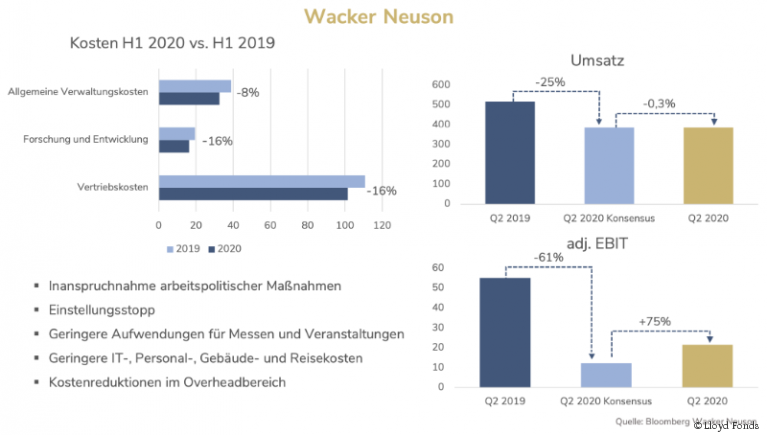 Indizien dafür lieferten die Unternehmensberichte zum Ende des zweiten Quartals. Europaweit gebe es einen positiven Überraschungseffekt bei vielen Mittelständlern. So sei bei den Firmen, die schnell auf die Krise reagierten, die Kostenbasis massiv angepasst worden. Sollten die Umsätze wieder steigen, sei das ein zusätzlicher positiver Effekt, der den Unternehmen beim Re-Start enorm helfe. Als Beispiel nennt Thaler das Unternehmen Wacker Neuson, wo die Kosten für Verwaltung, Forschung und Vertrieb im Vergleich zum Vorjahr deutlich gesunken seien. Das Unternehmen habe alle Register klassischen Krisenmanagements gezogen und gleichzeitig die Möglichkeiten genutzt, die die Regierung Firmen zur Verfügung gestellt hat, um die Krise zu überstehen.