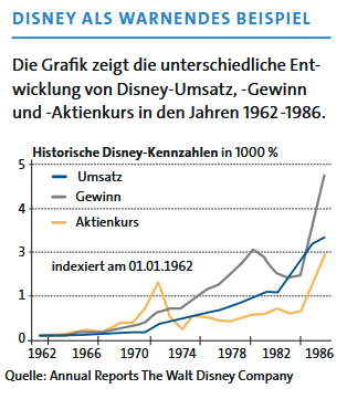 Betrachten wir als Beispiel den Mediengiganten Disney. The House of Mouse steigerte seinen Jahresüberschuss zwischen 1962 und 1972 um fast 800 Prozent, der Aktienkurs legte hingegen um mehr als 1600 Prozent zu. Das Kurs-Gewinn-Verhältnis (KGV) erreichte 1972 einen Wert von 72. Aber mit Beginn der Rezession 1973 sanken auch die Aktienkurse der Nifty Fifty. Disney verlor bis zum Ende des Jahres 1974 etwa 82 Prozent seines Börsenwerts.