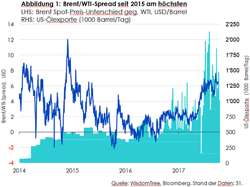 Doch nicht alle Ölpreise entwickeln sich gleich. Tatsächlich übertrifft Brent WTI seit Juni 2017, was zu einer Erhöhung des Brent/WTI-Spreads auf 6 USD geführt hat – der höchste Stand seit 2015.