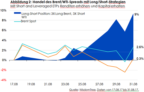 Investoren hätten die Erhöhung des Spreads mithilfe einer einfachen Paarstrategie handeln können: bei Brent long und bei WTI short gehen. Investoren, für die die Kapitalerhaltung eine Rolle spielt, könnten Short and Leveraged ETPs in Betracht ziehen, bei denen gegenüber einer Position ohne Hebeleffekt typischerweise nur ein Bruchteil des Kapitals erforderlich ist.