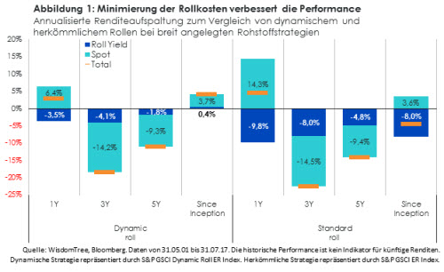 Der WisdomTree Enhanced Commodity UCITS ETF (Tickercode: WCOA) kombiniert die dynamische Rollierungsmethodik von S&P mit den Konstituenten und Einstiegsgewichtungen des Bloomberg Commodity Index (BCOM), wodurch sich ein einzigartiges Instrument mit niedriger Volatilität ergibt, das Zugang zu Rohstoffen bietet. Doch Investoren fragen sich wahrscheinlich: Was ist das „dynamische Rollen“, wie funktioniert es und warum handelt es sich dabei um einen möglicherweise besseren Ansatz für ein Engagement in Rohstoffen?