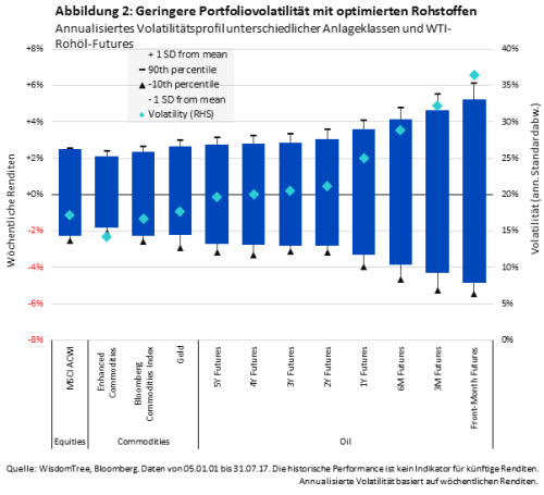Angesichts dessen, dass beim dynamischen Rollen tendenziell in sehr langfristige Futures in Contango-Märkten investiert wird, wird die Sensibilität gegenüber Spot-Preisen unterdrückt. Dies untermauert das geringere Volatilitätsprofil (14,2 %) des WisdomTree Enhanced Commodity UCITS ETF gegenüber dem BCOM (16,7 %) und anderen Anlageklassen, einschließlich diversifizierter Aktien (17,2 % für MSCI ACWI) und Gold (17,7 %). Aus Sicht der Asset-Allokation senken die Allokationen des WisdomTree Enhanced Commodity UCITS ETF potenziell die allgemeine Portfoliovolatilität.