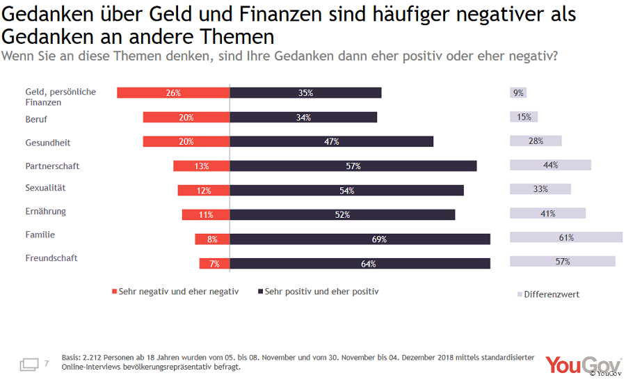 Die schlechte Nachricht: Glaubt man der Umfrage, ist leider etwa jeder vierte Gedanke (26 Prozent) an Geld und Finanzen mit negativen Emotionen verbunden. Nur 35 Prozent der Gedanken an Geldthemen sind positiv. Im Vergleich zu anderen Themen sind Geld und persönliche Finanzen sogar die am negativsten besetzten Themen für die Deutschen. Es folgen die Themen Beruf und Gesundheit, mit denen jeder fünfte Befragte negative Emotionen verbindet.