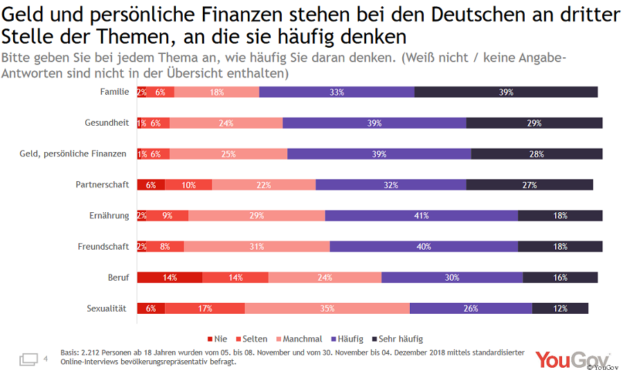 Geld ist uns Deutschen offensichtlich wichtig. Das zeigt die aktuelle Studie „Regiert Geld die Deutschen?“ des internationalen Marktforschungs- und Beratungsinstituts YouGov. Demnach denken zwei Drittel aller Deutschen häufig an Geld und persönliche Finanzen. Damit rangiert diese Kategorie auf Platz drei hinter den Themen Familie (73 Prozent) und Gesundheit (68 Prozent)