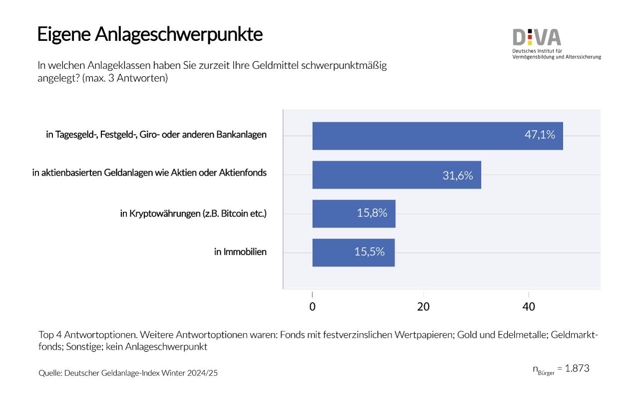 Abbildung: Unter den präferierten Geldanlagen führen Termin- und Festgelder sowie Girokonten mit 47,1 Prozent das Feld an. Aktienanlagen folgen mit 31,6 Prozent auf Platz zwei. Kryptowährungen landen mit 15,8 auf Platz drei, knapp vor Immobilien mit 15,5 Prozent. In Bezug auf Kryptowährungen warnt das DIVA vor unüberlegter Risikobereitschaft.