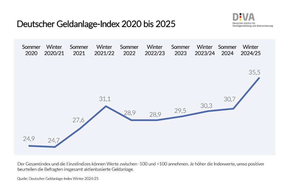 Die Einstellung der Deutschen zu Aktien und aktienbasierten Geldanlagen hat sich in den letzten 6 Monaten und noch weitaus mehr im 4-Jahres-Trend signifikant verbessert. Das spiegelt der Deutsche Geldanlage-Index des DIVA (DIVAX-GA) wider, der seit Sommer 2020 halbjährlich die Stimmung in der Bevölkerung zu aktienbasierten Geldanlagen misst und Werte von -100 bis +100 Indexpunkte einnehmen kann. Der Index ist im Januar 2025 im Vergleich zum Sommer 2024 von 30,7 auf einen neuen Spitzenwert von 35,5 Punkte gesprungen. Im Sommer 2020 lag der Wert noch bei 24,9, also mehr als zehn Punkte unter dem heutigen Niveau.