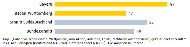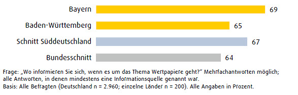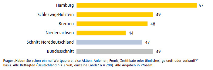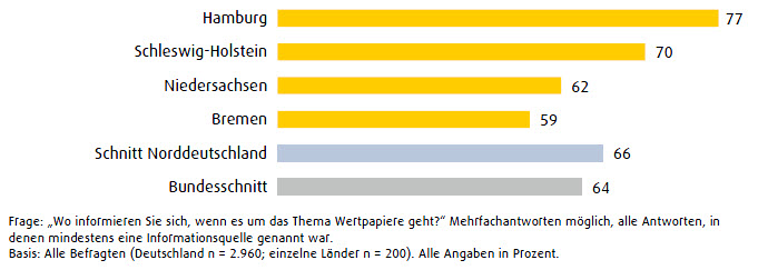 Die Hamburger liegen zudem in Sachen Information ganz vorne: 77 Prozent der Befragten gaben an, sich über Wertpapiere zu informieren. Schleswig-Holstein folgt mit 70 Prozent. Die Bayern liegen mit 69 Prozent knapp dahinter. Insgesamt informiert sich der Süden Deutschlands mit 67 Prozent ein wenig stärker als der Norden (66 Prozent). Die Menschen in Bremen zeigen sich mit 59 Prozent am wenigsten interessiert. Der Bundesdurchschnitt liegt bei 64 Prozent.