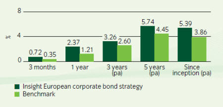 Source: Insight Investment. As at 30 June 2017. Gross of fees. All returns over one year are annualised and are in EUR. Inception date: 31 August 2005. Benchmark: iBoxx Euro. Corporates Index since 30 September 2010; previously Barclays Capital Euro Aggregate Credit Index.