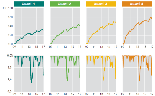 Die Fonds des untersten Quartils (mit der geringsten Kreditqualität) sind seit der Finanzkrise besonders erfolgreich. Von 2009 bis 2016 haben sie sich jedes Jahr um durchschnittlich 2,6 Prozentpunkte besser entwickelt als die Fonds aus dem ersten Quartil (und um 1,6 Prozentpunkte besser als die Fonds aus dem zweiten). Als 2013 bekannt wurde, dass die Fed ihre Anleihenkäufe zurückführen will und die Märkte in Aufruhr gerieten, verloren die Fonds aus dem vierten Quartil 3,8%. Die Fonds aus dem ersten Quartil (mit den höheren Ratings) gaben um 4,1% nach. In dieser Zeit, als man also vor allem höhere Zinsen fürchtete, halfen Unternehmensanleihen, das Zinsrisiko zu diversifizieren.