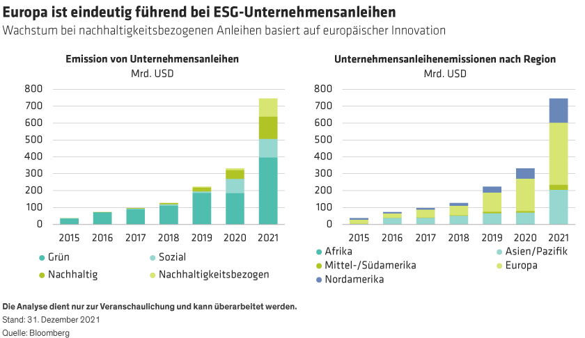 Verantwortungsbewusstes Investieren gewinnt immer mehr an Bedeutung. Im Jahr 2022 werden wir wahrscheinlich ein noch größeres Interesse der Anleger an Umwelt-, Sozial- und Unternehmensführungsfaktoren (ESG) und einen weiteren Anstieg der Emission von grünen und anderen nachhaltigkeitsbezogenen Anleihen erleben.