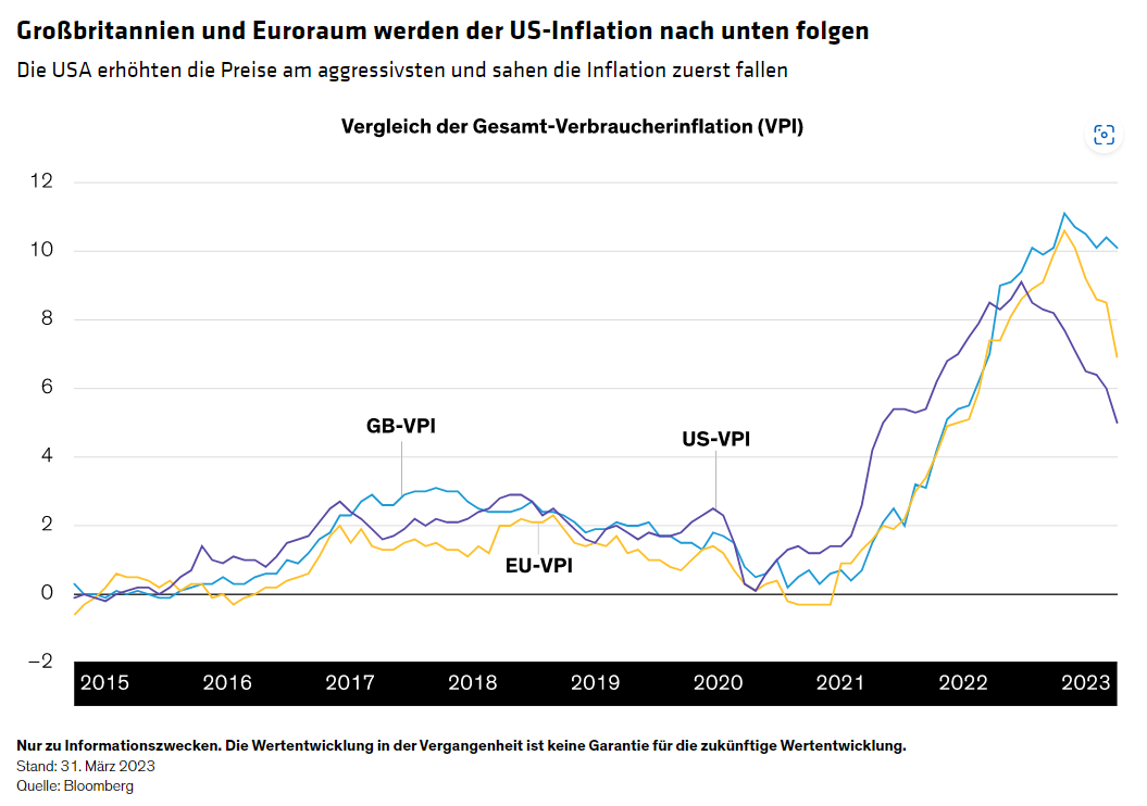 Wir glauben, dass die Bankenkrise in den USA und in Europa ein wichtiger Vorläufer für diese Veränderung ist. Die Krise hat die Banken dazu gezwungen, die Kreditvergabe einzuschränken, was die Finanzierungsbedingungen verschärft und das Wirtschaftswachstum gebremst hat. Diese Verschärfung der Bedingungen nimmt den Zentralbanken einen Teil ihrer Arbeit ab und zieht den Zeitpunkt vor, an dem sie die Zinsen nicht mehr erhöhen müssen.