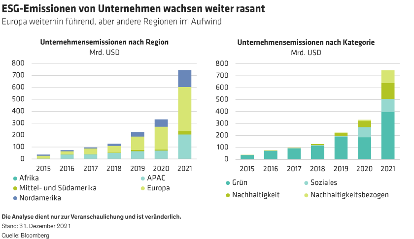 Eine Explosion von ESG-Anleiheemissionen: Die Emission von ESG-Anleihen erreichte im Jahr 2021 einen neuen Höchststand. Obwohl Europa weiterhin führend ist, haben weitere Regionen diese Finanzierungsstrukturen schnell übernommen.