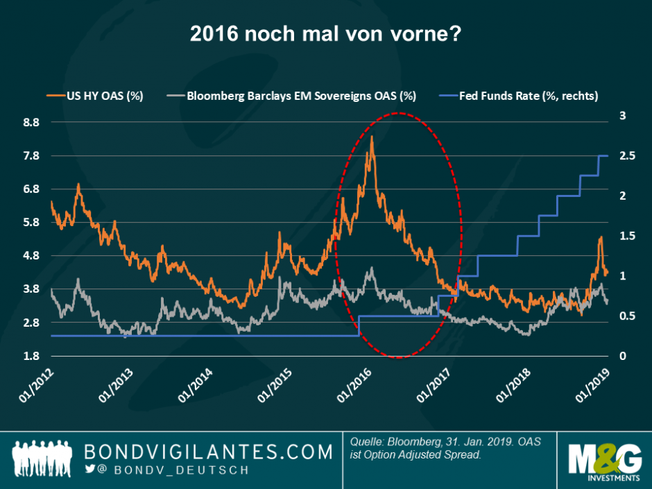 Die Märkte setzten sich gegen die Fed durch – erneut: In den letzten fünf Jahren haben die Anleger die optimistischen Wachstums- und Inflationsprognosen der Fed in Frage gestellt und eine wesentlich geringere Wahrscheinlichkeit für eine Straffung der Geldpolitik eingepreist als die Zentralbank. Sie haben in jedem Jahr Recht behalten; die US-Inflation konnte keine echte Dynamik aufbauen, und das von Steuersenkungen getriebene Wachstum des letzten Jahres lässt allmählich nach. Es ist nicht das erste Mal, dass die Fed von ihren Plänen abweicht: Nachdem Yellen im Dezember 2015 die Zinsen anhob – das erste Mal seit 2006 –, plante sie 2016 weitere Zinserhöhungen. Doch die Fed musste einen Gang runter schalten, da das Brexit-Referendum, der sinkende Ölpreis, die Spannungen um die Liquidität einer großen europäischen Bank und eine Verlangsamung in China das globale Wachstum gefährdeten und die Inflation gedämpft hielten. Das gleiche Muster scheint sich jetzt zu wiederholen: niedrige Energiepreise, eine Verlangsamung in China und Spannungen in Europa (immer noch Brexit). Entsprechend der Reaktion der Anleger auf den Stillstand der Fed im Jahr 2016 waren sie auch gestern schnell dabei, riskante Vermögenswerte aufzunehmen: Wie in der Grafik zu sehen ist, engten sich 2016 die Spreads von Hochzinsanleihen um 400 Basispunkte ein. Gleichzeitig sank auch die Prämie, die Anleger für das Halten von Staatsanleihen der Schwellenländer verlangen. Das Spreadniveau ist aktuell zwar niedriger, einige Anleger glauben jedoch, dass der höhere Kupon, den riskante Vermögenswerte typischerweise bieten, positive Gesamtrenditen liefern könnte, wenn es keinen Kursverlust aufgrund eines steigenden Leitzinses gibt.