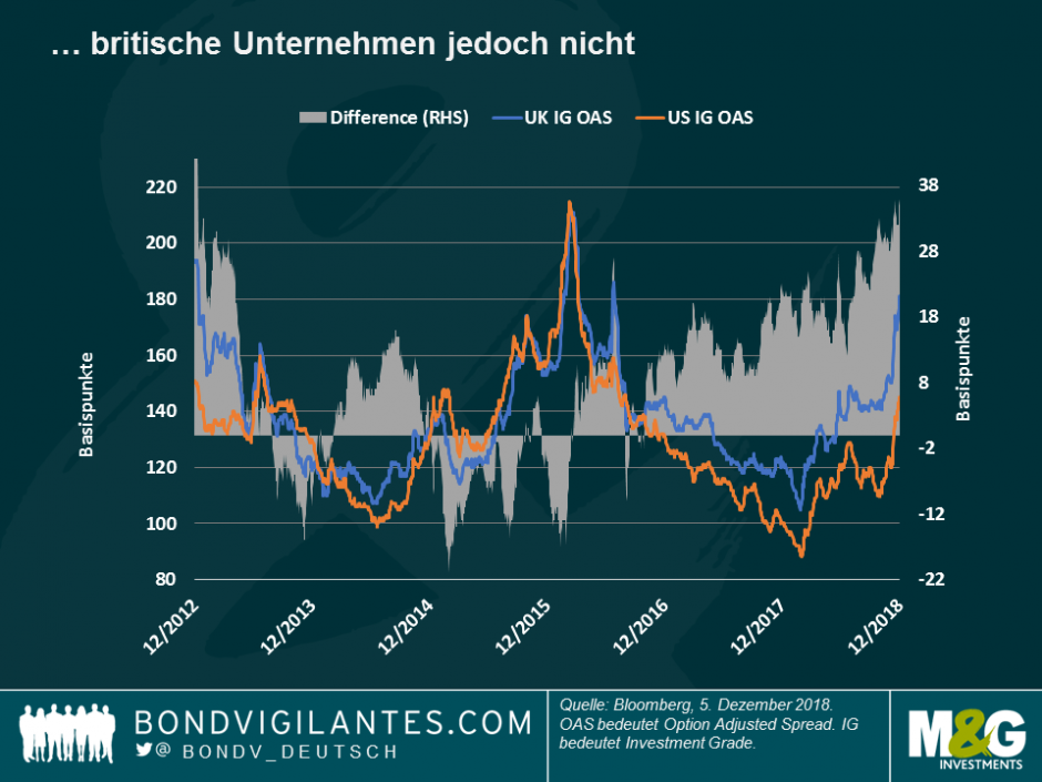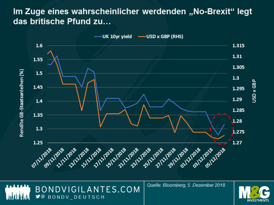 Großbritannien – Brexit oder kein Brexit: In echtem, dramatischem Stil wie bei Shakespeare drängte das Unterhaus darauf, sein Mitspracherecht zu erhöhen, falls Premierministerin Theresa Mays Brexit-Abkommen die Abstimmung vom 11. Dezember im Parlament nicht besteht, wie es allgemein erwartet wird. Derzeit ist mit Blick auf die möglichen Ergebnisse noch allen offen: Ein innerparteilicher Putsch der konservativen Landesführung, eine Parlamentswahl, ein zweites Referendum über die EU-Mitgliedschaft, eine Verschiebung der Entscheidung über den Austritt und sogar eine vollständige Aufhebung des Abkommens. Die Finanzmärkte interpretierten die Entwicklungen als ein Zeichen dafür, dass der Verbleib in der EU eine zunehmende Möglichkeit darstellt, was zu einer leichten Aufwertung des Pfunds führte. Wie in der ersten Grafik zu sehen ist, stiegen auch die Renditen britischer Staatsanleihen aufgrund einer geringeren Nachfrage nach als sicher geltenden Anlagen. Die Inflationserwartungen gaben leicht nach, da ein stärkeres Pfund zu einer Eindämmung steigender Importpreise beiträgt. Britische Unternehmen sahen jedoch keine Erleichterung: Die Differenz in der Risikoprämie, die Investoren verlangen, um britische Investment-Grade-Anleihen gegenüber ihren US-Pendants zu halten, stieg auf 36 Basispunkte an, den höchsten Wert seit dem Höhepunkt der europäischen Staatsschuldenkrise 2012. Nach zwei turbulenten Jahren der Verhandlungen scheint zum jetzigen Zeitpunkt nur eines sicher – es ist noch alles offen.