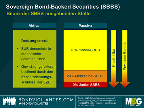 Wie die traditionelleren Asset-Backed-Securities auch würden SBBS zwei wesentliche Eigenschaften aufweisen: Die Bündelung von Vermögenswerten und die Tranchierung des Risikos. Die SBBS ausgebende Stelle behält einen Deckungsstock aus Staatsanleihen als Aktiva in der Bilanz. Der Einfachheit und Transparenz halber könnte es von Vorteil sein, nur EUR-denominierte Staatsanleihen aus Mitgliedstaaten der Eurozone in den Pool aufzunehmen und die Portfoliogewichtungen anhand des Kapitalzeichnungsschlüssels der EZB festzulegen. Geringere Abweichungen könnten jedoch eingegangen werden, um Mitgliedstaaten mit niedrigen Außenständen gerecht zu werden oder um die Aufnahme von Anleihen von nicht-EU-Mitgliedstaaten zu ermöglichen, was die Diversifizierung verstärken würde.