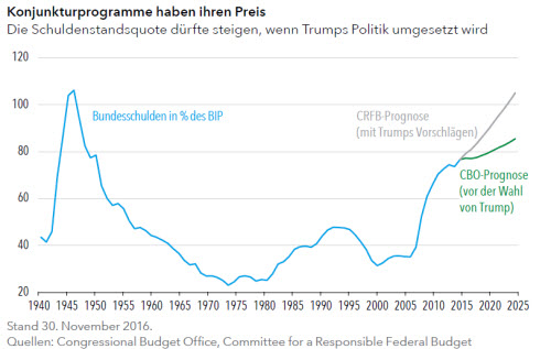 Doch wenn diese Pläne so rasch und in dem Ausmaß umgesetzt werden, wie Trump möchte, könnte die Nachhaltigkeit der Staatsfinanzen leiden. Am US-Staatsanleihenmarkt würde sich das Verhältnis von Angebot und Nachfrage verschlechtern. Die vielleicht größte Sorge für Investoren ist aber, dass sich die Fed zu schnelleren Zinserhöhungen entschließen könnte.