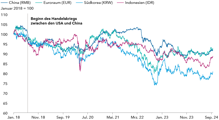Die größten Auswirkungen auf Emerging-Market-Währungen dürfte nach den Wahlen die Zollpolitik haben. Immer wieder bezeichnet Ex-Präsident Trump, der republikanische Kandidat, Zölle als wichtigstes Element seiner Außenhandelspolitik, vor allem wenn sie gegen China gerichtet sind. In Trumps erster Amtszeit wurde der Durchschnittszoll auf Importe aus China von 4% auf 17% erhöht. Nach einer WHO-Studie1ging der Handel zwischen den USA und China dadurch deutlich zurück, während der Handel mit anderen Regionen kräftig zunahm.