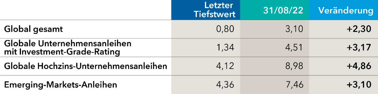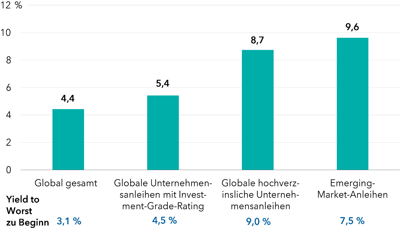 Renditen und Erträge zum 31.08.2022 in USD. Die Daten reichen für alle Sektoren bis ins Jahr 2000 zurück, mit Ausnahme von Schwellenländeranleihen, die bis 2003 zurückreichen. Basierend auf den durchschnittlichen monatlichen Renditen für jeden Sektor bei einer Spanne von +/- 0,30 % Yield-to-Worst. Die oben genannten Sektorrenditen beziehen sich auf den Bloomberg Global Aggregate Index, den Bloomberg Global Aggregate Corporate Index, den Bloomberg Global High Yield Index und eine Mischung aus 50% JPMorgan EMBI Global Diversified Index / 50% JPMorgan GBI-EM Global Diversified Index. Quellen: Capital Group, Bloomberg