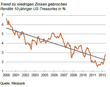 Eine so starke Zunahme in so kurzer Zeit hat es in Amerika in diesem Jahrhundert noch nicht gegeben (siehe Grafik). Besonders deutlich war die Bewegung in den letzten drei Monaten seit der Bekanntgabe, dass die Federal Reserve ihre Wertpapierkäufe im Rahmen des Quantitative-Easing-Programms zurückführen wird ("Tapering"). Kann sich der Zinsanstieg noch weiter fortsetzen? Ist das das Ende der niedrigen Zinsen?