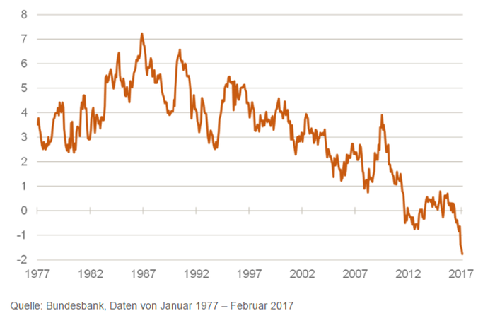 Dass die Renditen weiter steigen, steht außer Frage. Die Realzinsen, das heißt die Nominalzinsen abzüglich der Preissteigerung, liegen im Euroraum derzeit bei minus 1,5 %. So niedrig waren sie noch nie seit Beginn der Währungsunion. Auch in der Zeit der D-Mark gab es nie so niedrige Realzinsen (siehe Grafik). Die Inflation ist den Zinsen weit davon gelaufen. Das kann so nicht bleiben.