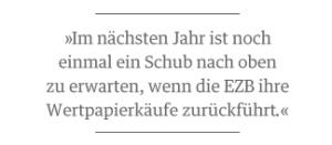 Darüber hinaus muss man berücksichtigen, dass die Leitzinsen der EZB nach wie vor sehr niedrig sind. Das zieht die Langfristzinsen nach unten. Andererseits sind die US-Zinsen sehr hoch. Sie bewirken für sich genommen höhere Zinsen in Europa. Insgesamt gehe ich davon aus, dass ein normales Zinsniveau für 10-jährige Bundesanleihen unter den gegebenen Bedingungen etwa in der Größenordnung von 2 % liegt. Das sind rund 1,5 Prozentpunkte mehr als heute. Im nächsten Jahr ist noch einmal ein Schub nach oben zu erwarten, wenn die EZB ihre Wertpapierkäufe zurückführt. In den USA, wo das Quantitative Easing schon lange beendet ist, müssten die Zinsen in 2017 bis auf 4 % steigen.