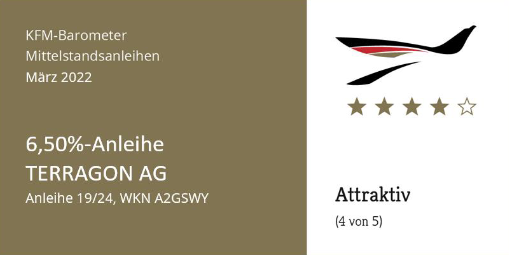 Die „6,50%-TERRAGON AG-Anleihe 19/24“ wird weiterhin als „attraktiv eingeschätzt.