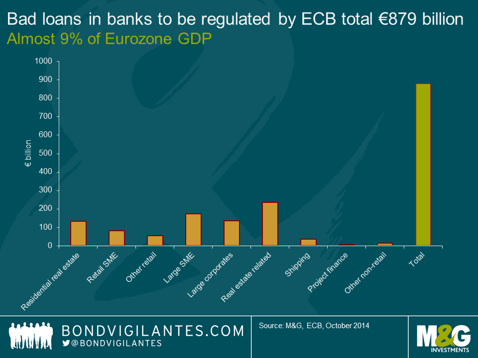 Der Stresstest der EZB ist einigermaßen glimpflich ausgegangen, doch auf Seite 67 des Berichts verbirgt sich eine unschöne Überraschung: Die Bad Loans in der Eurozone belaufen sich insgesamt auf 879 Milliarden Euro – das sind fast 9 Prozent der Wirtschaftsleistung in der Eurozone! Was uns wirklich Angst macht: Notleidende Darlehen sind ein Indikator mit Verzögerung. Die wirkliche Situation ist wahrscheinlich wesentlich schlimmer als die bekannten 879 Milliarden Euro.