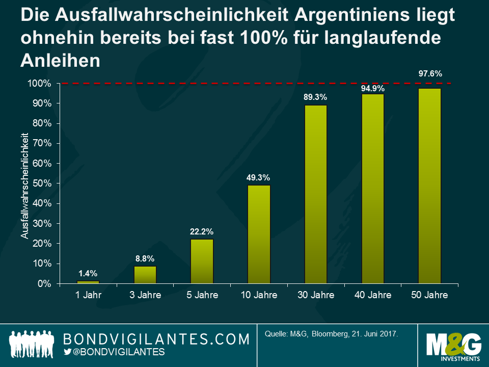 Aufgrund der ungewöhnlichen Laufzeit der Anleihe drosselte das Modell nach 50 Jahren runter. Wir können jedoch sehen, dass die implizite Wahrscheinlichkeit für einen Ausfall einer Anleihe mit einer Laufzeit von 50 Jahren auf Grundlage dieser Annahmen schon bei 97% liegt. Demnach sollte eine Jahrhundert-Anleihe nicht als wesentlich riskanter betrachtet werden. Anders ausgedrückt ist das aktuelle Niveau der argentinischen Spreads ein instabiles Gleichgewicht: Entweder werden sich die Fundamentaldaten weiterhin verbessern und Credit Spreads werden über die kommenden Jahrzehnte weiter fallen oder die Geschichte wird sich wiederholen – die Fundamentaldaten werden nicht besser und Argentinien wird erneut ausfallen. Im letzteren Fall ist es beinahe unwichtig, ob man eine 50-jährige Anleihe oder eine Jahrhundert-Anleihe hält.