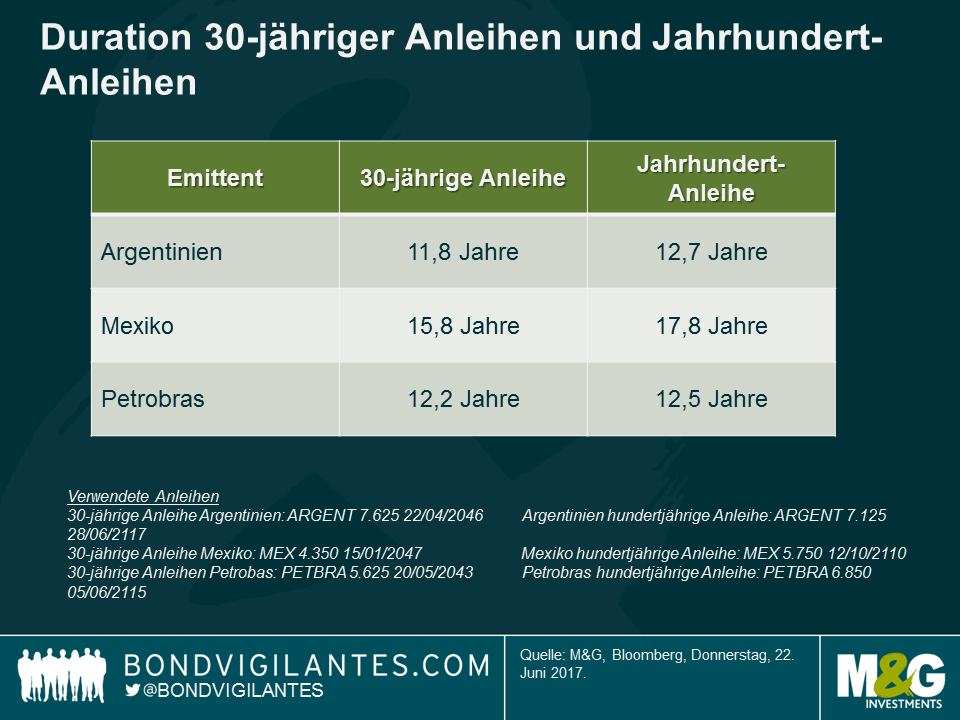 Duration: Wie wir bereits geschrieben haben, ist die Duration von 100-jährigen Anleihen nicht viel länger als die Duration von 30-jährigen Anleihen, die ihrerseits in den Schwellenländern und auch in Argentinien recht üblich sind.