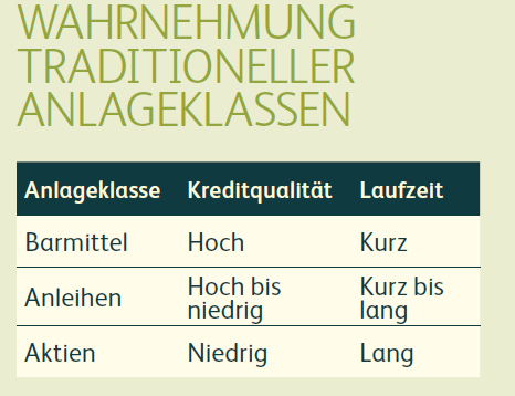 In der nachfolgend aufgeführten Tabelle werden die allgemeinen Risikoeigenschaften dieser drei Anlageklassen beschrieben und es scheint so, als wären Anleihen die „goldene Mitte“ zwischen Barmitteln und Aktien. Wichtig zu erwähnen ist hierbei, dass die Risiko und Ertragseigenschaften innerhalb der verschiedenen Rentenklassen aufgrund des vielfältigen Angebots an verfügbaren Anleihen stark variieren können. Aus diesem Grund ist die herkömmliche Betrachtungsweise von Rentenanlagen zu einfach.