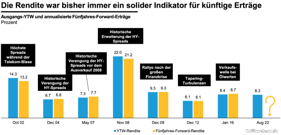 Das Risiko sei auf absehbare Zeit auch begrenzt. Denn viele Anleihen notierten bei nur 80 Prozent. Je nach Restlaufzeit würden sich schon aufgrund der Rückzahlungsgarantien von 100 Prozent am Laufzeitende hohe Gewinnchancen ergeben – vorausgesetzt natürlich, die Anleihen würden zurückgezahlt. Die Chancen dafür stünden insgesamt gut. Denn nur 20 Prozent des Hochzinsmarkts würden in den nächsten drei Jahren fällig. Im Klartext hieße dies, dass mit Sicht auf die kommenden drei Jahre nur wenige Unternehmen in Zahlungsschwierigkeiten aufgrund von hohen Rückzahlungen und teureren Refinanzierungen kommen könnten. Gleichzeitig seien die Unternehmen mit einer Hebelung von drei bis vier in ihren Bilanzen vergleichsweise solide aufgestellt. Die Eigenkapitalausstattung sei im historischen Vergleich gut. Man müsse nicht befürchten, dass viele Unternehmen unvorbereitet in den Zinssteigerungs-Zyklus liefen. Die implizite Ausfallquote schätzen die AB-Analysten auf rund sieben Prozent, so Peters. Dies sei eine pessimistische Annahme. Das Fondsmanagement des Rentenfonds AB Climate High Income Portfolio nutze dieses Zeitfenster, das sich derzeit auftue, um gezielt in passende Assets zu investieren.
