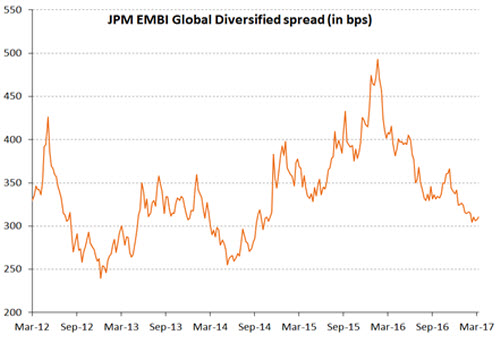 Der Benchmark-Index für Schwellenländeranleihen in Hartwährung, der EMBI Global Diversified Index, stieg im ersten Quartal 2017 um 3,87 Prozent. Der Indexspread engte sich zum Quartalsende um 31 auf 310 Basispunkte ein. Stabile Rohstoffpreise (insbesondere für Öl) und günstigere Fundamentaldaten für die Schwellenländer wirkten sich günstig auf die Performance dieser Anlageklasse aus. Daneben hatte der Rückgang externer Risiken einen positiven Effekt; so blieben in den USA etwaige protektionistische Schritte begrenzt. Die soliden Kapitalzuflüsse des Jahres 2016 setzten sich im ersten Quartal 2017 ebenfalls fort, so dass auch das technische Umfeld günstig war.