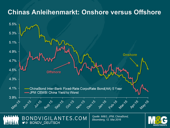 Theoretisch hätte das weichere wirtschaftliche Umfeld und das höhere Ausfallrisiko in China die Renditen am heimischen Anleihenmarkt nach oben drücken müssen. In der Realität traf eher das Gegenteil zu. Aufgrund der Zinssenkungen und der zunehmenden Anleihenkäufe durch Privatbanken infolge des Börsencrashs sind die Renditen auf Unternehmensanleihen im Jahr 2015 signifikant zurückgegangen. Diese Abkopplung von Fundamentaldaten im Verhältnis zu den Bewertungen wurde gleichermaßen bei den Renditen auf in USD lautende Anleihen chinesischer Unternehmen beobachtet, die sich im Laufe des Jahres 2015 – dank unterstützender technischer Marktfaktoren und trotz schlechter werdender Fundamentaldaten (weichere Makroökonomie, schlechtere Qualität der Vermögenswerte von Banken, Überangebot und geringere Wachstumsraten für Bauunternehmen, höherer Verschuldungsgrad von einer Vielzahl an Staatsunternehmen, usw.) – überaus positiv entwickelten.