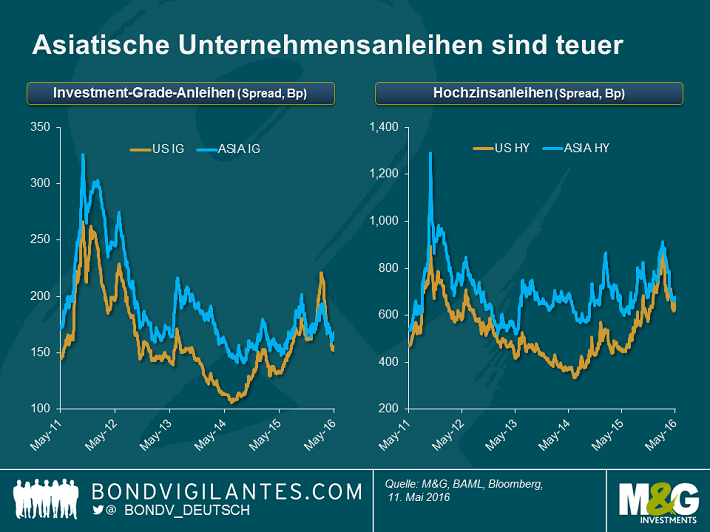 Aus der Perspektive globaler Anleger ergab sich daraus eine recht unattraktive Bewertung von Offshore-Anleihen. Erstens können Anleger in Schwellenländeranleihen höhere Anleihenrenditen außerhalb Chinas finden, die sowohl das Potenzial für einen positiven Carry haben als auch einen Kapitalzuwachs bei Unternehmensanleihen mit starken Fundamentaldaten bieten. Dies gilt vor allem mit Blick auf Schuldtitel, die aufgrund der negativen Marktstimmung für die Anlageklasse insgesamt, übermäßig abgestraft wurden. Zweitens sind chinesische USD-Anleihen aufgrund der Preiskorrektur bei Unternehmensanleihen in Industriestaaten und insbesondere in den USA, sehr teuer. Dies umso mehr, wenn man das Risiko der Nachrangigkeit (gegenüber inländischen Anleihen) berücksichtigt, das Offshore-Anleger in China tragen. Die folgende Grafik veranschaulicht die straffen Bewertungen in Asien (ein Großteil davon in China) gegenüber US-amerikanischen Investment-Grade und Hochzinsanleihen.