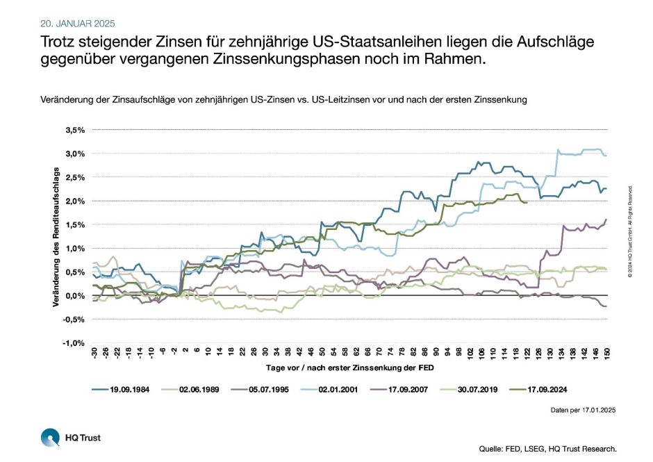Der Fondsselektor und Portfoliomanager von HQ Trust betrachtet in seiner neuen Untersuchung die Entwicklung der Renditen zehnjähriger US-Staatsanleihen rund um die erste Zinssenkung der Fed. Dabei blickt Jan Tachtler auf den sogenannten Spread, also die Differenz von zehnjährigen US-Zinsen und den Leitzinsen im Zeitraum von 30 Tagen vor dem ersten Zinsschritt bis 150 Tage danach. Die Analyse umfasst die vergangenen 50 Jahre – und damit insgesamt sieben Zinssenkungsperioden der US-Notenbank.