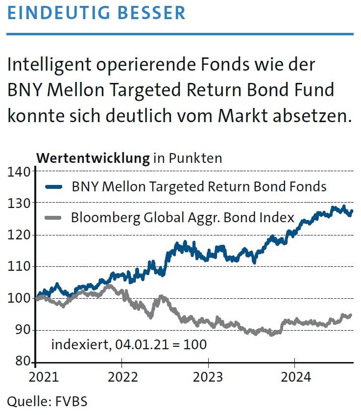 Deutlich besser abgeschnitten haben nur ganz wenige global anlegende Fonds wie etwa der BNY Mellon Targeted Return Bond Fund. Er investiert ohne Einschränkungen in das gesamte Spektrum des Rentenmarkts und verfolgt dabei ein festes Ertragsziel von durchschnittlich sechs Prozent pro Jahr über einen Zeitraum von drei bis fünf Jahren. Das hohe Ziel wurde zuletzt nicht erreicht, dennoch konnte sich der Fonds deutlich von seinen Mitbewerbern absetzen. Auch in diesem Jahr läuft es prächtig. Fondsmanager Brendan Murphy sieht hohes Renditepotenzial bei kurz laufenden Hochzinsanleihen, US High Yield Beta, europäischen Investment-Grade-Anleihen und Unternehmensanleihen aus den Schwellenländern.
