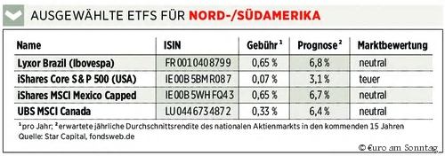 Nord- /Südamerika: Dominierend in dieser Region sind aus Anlegersicht zweifellos die USA. Weit über 100 ETFs mit den unterschiedlichsten Strategien setzen auf die größte Volkswirtschaft der Welt. Sehr viel übersichtlicher ist das Angebot für den nördlichen Nachbarn Kanada sowie für Mexiko. In Südamerika können Anleger mithilfe einiger ETFs direkt auf Brasilien setzen. Das Land ist auch Schwergewicht in Lateinamerika-ETFs, die zudem in Mexiko, Chile, Kolumbien und Peru anlegen.